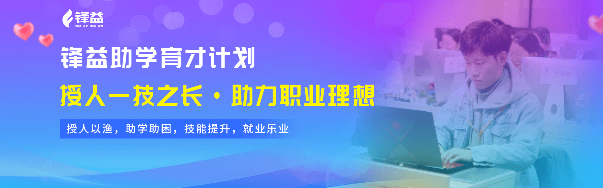鋒益由千鋒教育發起,是千鋒教育旗下一個公益子品牌。鋒益延續了千鋒教育“用良心做教育”的理念,堅持“致知、正心、擔當、筑夢”核心價值觀,致力于成為一個有溫度、有行動的公益平臺,幫助更多人改變命運,實現夢想。鋒益依托千鋒教育強大的師資力量,前沿的課程體系,成熟的就業服務體系,以及多年來積累公益活動經驗,通過教育資源共享、捐贈物資、志愿服務、助學支教、公益合作等多種方式來響應國家號召,推動公益事業的發展,幫助更多有需要的人士切實解決教育難題、文化難題、溫飽難題等社會難題,大力踐行“扶貧先扶志”“扶貧必扶智”行動,在拓寬人們“用科技看世界”視野的同時,切實解決生活難題,用實際行動打造一個充滿愛心的和諧社會。